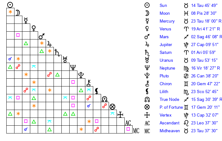 | Sun | 14 Taurus 45 | 15 Taurus 27 | 8 Leo 59 |