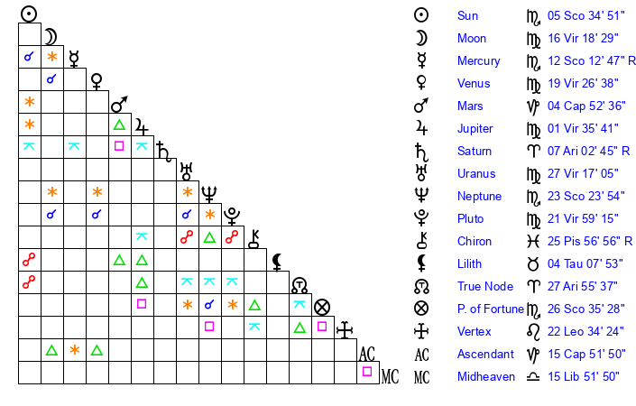 Moon | 16 Virgo 19 | 6 Libra 9 | 19 Libra 37 |