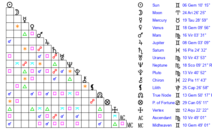 Venus | 18 Gemini 11 | 20 Aries 52 | 1 Virgo 20 |
