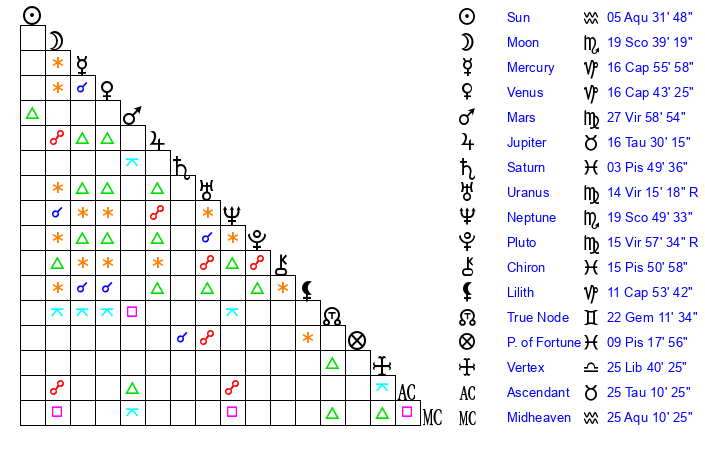 Uranus | 14 Virgo 19 | 23 Taurus 17 | 11 Virgo 54 |
