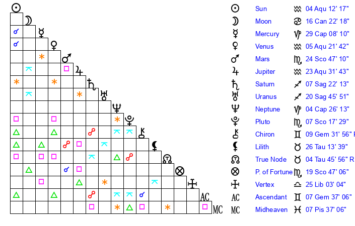 Sun | 4 Aquarius 12 | 4 Aquarius 45 | 13 Pisces 37 |