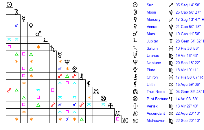 Moon | 27 Capricorn 1 | 26 Libra 22 | 19 Pisces 18 |