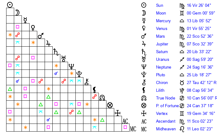 | Sun | 16 Virgo 26 | 17 Virgo 1 | 28 Libra 43 |
