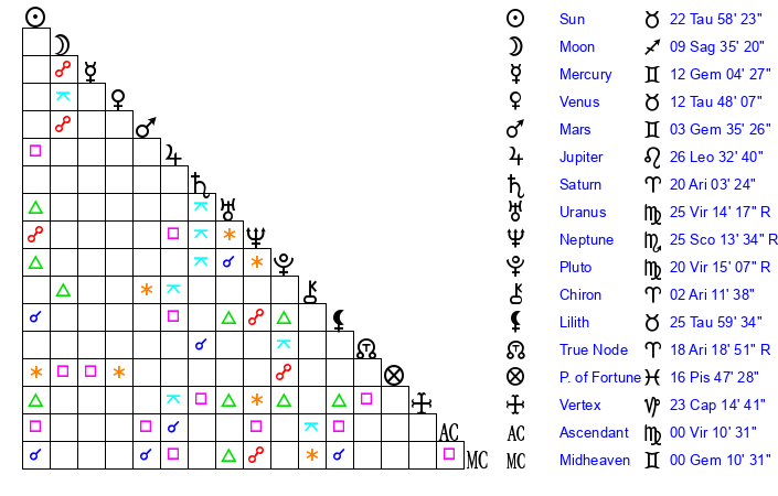 Uranus | 25 Virgo 18 | 27 Taurus 4 | 25 Virgo 45 |