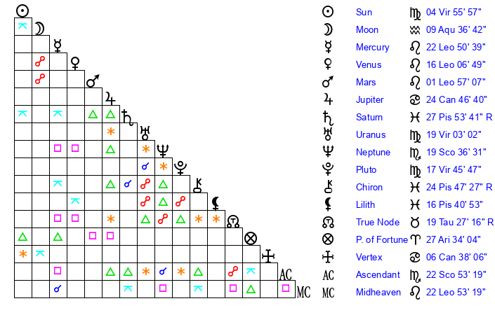 Mercury | 22 Leo 51 | 21 Leo 4 | 26 Scorpio 46 |