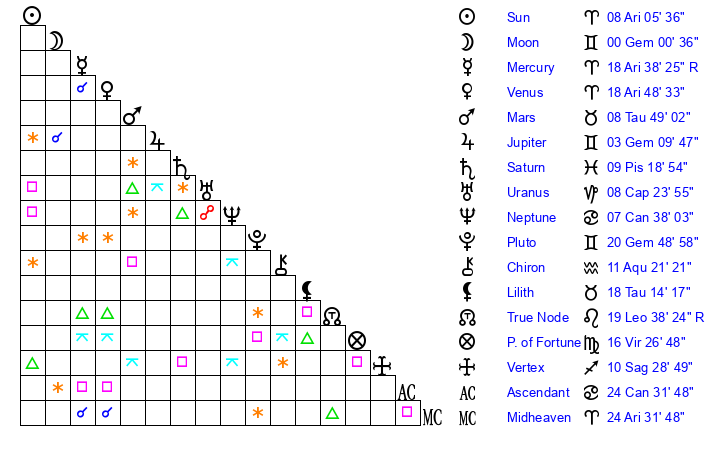 | Pluto | 20 Gemini 49 | 3 Aquarius 31 | 23 Gemini 10 |