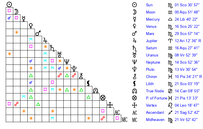 Moon | 0 Aquarius 51 | 18 Leo 3 | 27 Aries 10 |