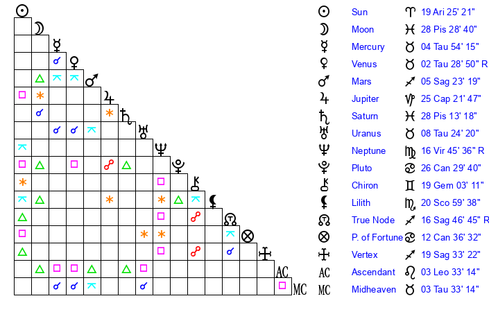 | Sun | 19 Aries 25 | 20 Aries 5 | 14 Cancer 10 |