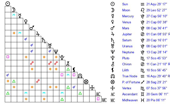 Mercury | 27 Capricorn 56 | 22 Aquarius 46 | 25 Pisces 5 |