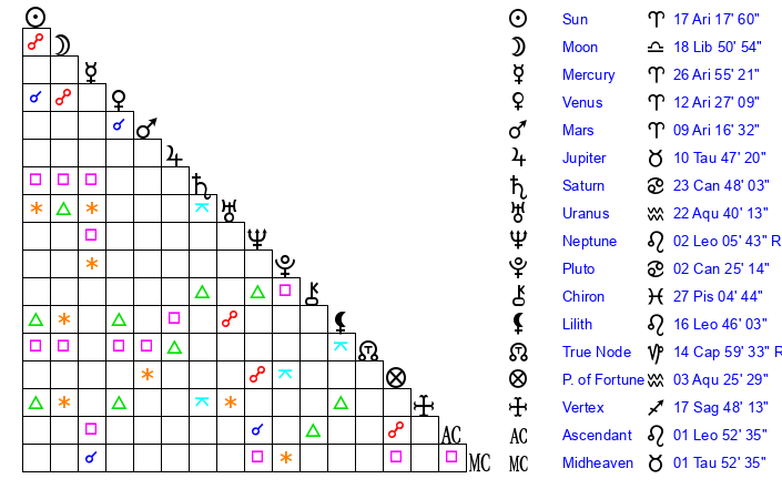 | Sun | 17 Aries 18 | 18 Aries 7 | 1 Leo 11 |
