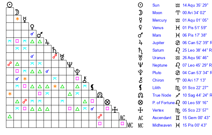 | Sun | 14 Aquarius 35 | 15 Aquarius 53 | 29 Taurus 20 |