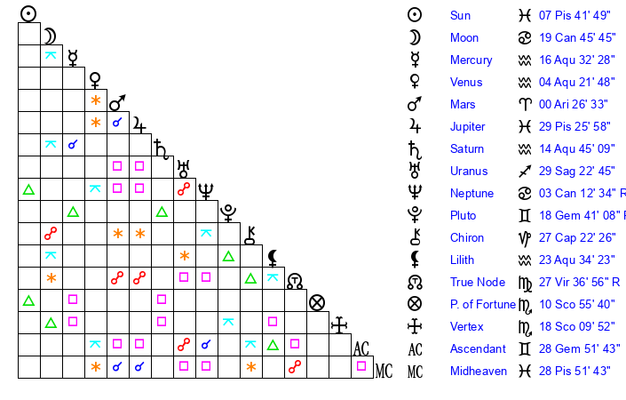 | Sun | 7 Pisces 42 | 9 Pisces 21 | 5 Cancer 34 |