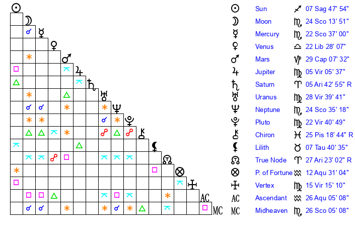 Sun | 7 Sagittarius 48 | 8 Sagittarius 59 | 5 Aquarius 49 |