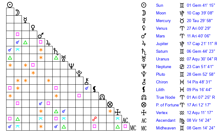 | Saturn | 7 Gemini 20 | 29 Pisces 46 | 18 Gemini 32 |