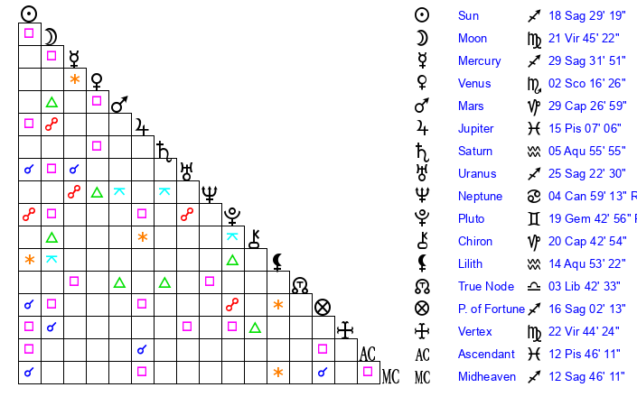 | Moon | 21 Virgo 38 | 18 Virgo 1 | 4 Pisces 32 |