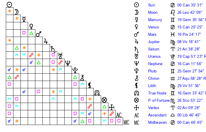 | Neptune | 16 Cancer 12 | 2 Aries 7 | 19 Cancer 20 |