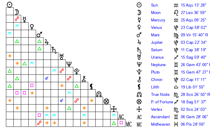 | Pluto | 15 Gemini 47 | 2 Aquarius 10 | 17 Gemini 11 |