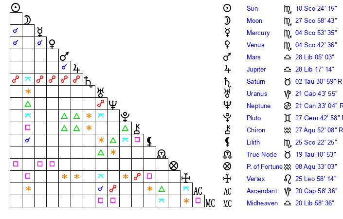 | Sun | 10 Scorpio 24 | 11 Scorpio 46 | 5 Pisces 59 |