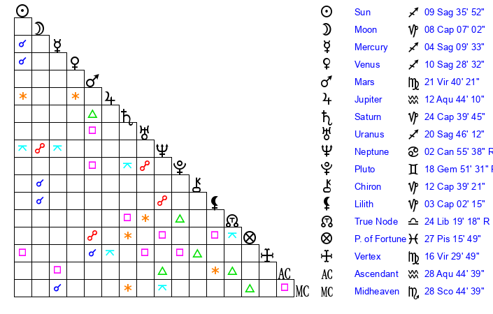| Uranus | 20 Sagittarius 43 | 28 Taurus 59 | 25 Sagittarius 35 |