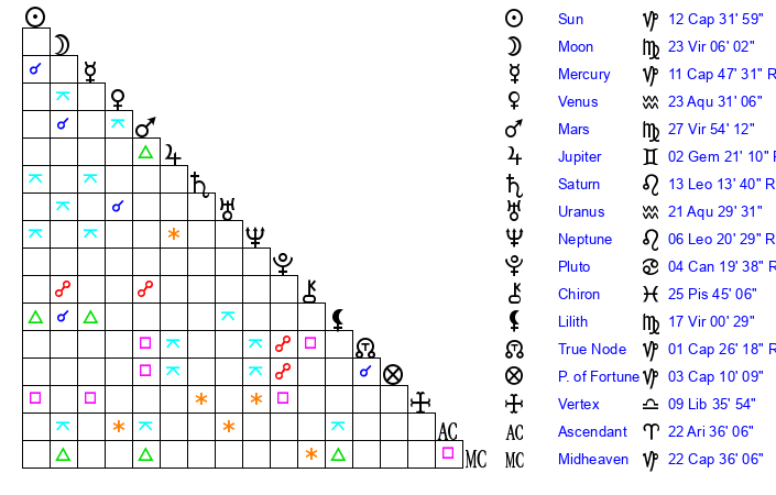 | Sun | 12 Capricorn 32 | 13 Capricorn 34 | 29 Aries 47 |