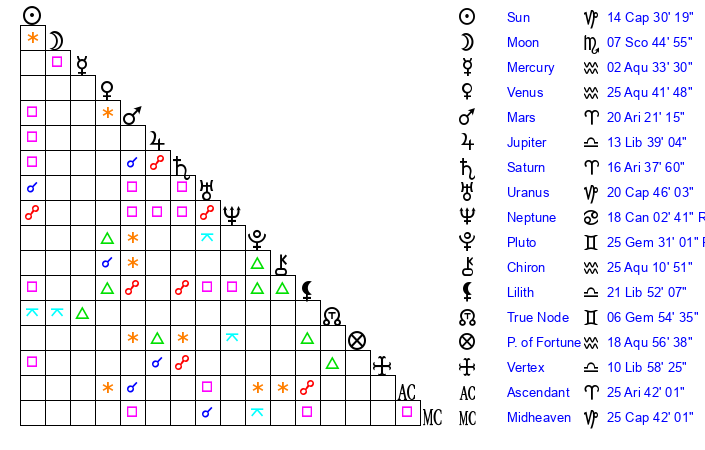 | Pluto | 25 Gemini 30 | 1 Aquarius 12 | 25 Gemini 19 |