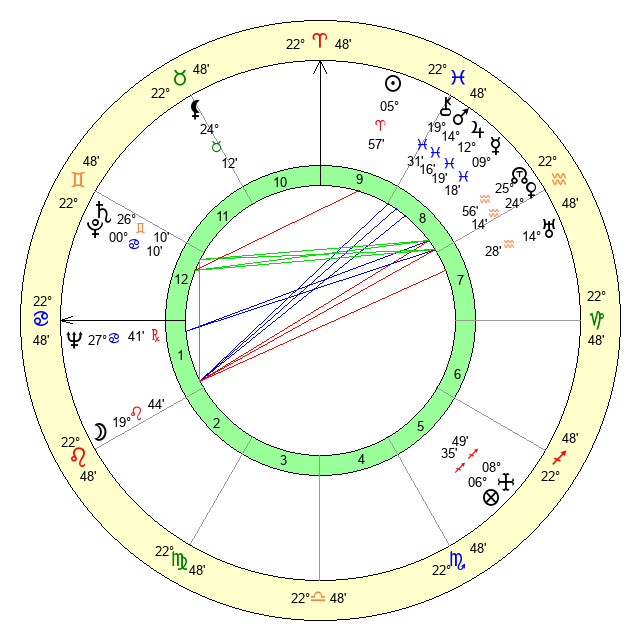 | Sun | 5 Aries 57 | 7 Aries 16 | 22 Cancer 6 |