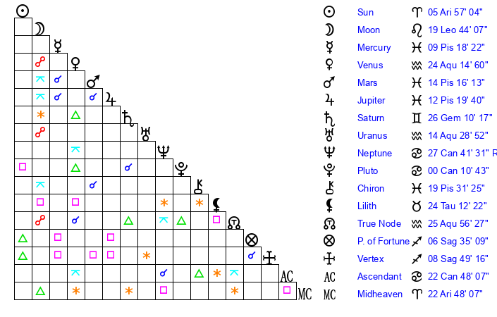 | Moon | 19 Leo 44 | 12 Pisces 58 | 0 Virgo 27 |