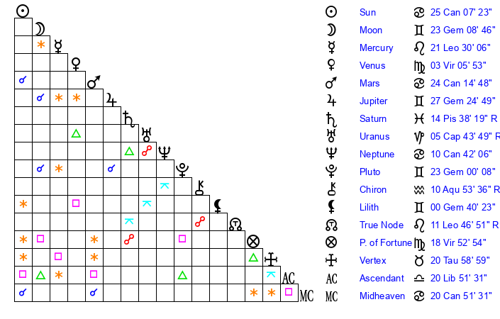 | Sun | 25 Cancer 8 | 26 Cancer 19 | 21 Scorpio 26 |