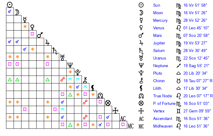 | Sun | 16 Virgo 52 | 16 Virgo 59 | 1 Scorpio 9 |