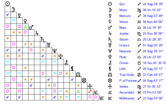 | Neptune | 24 Sagittarius 35 | 29 Pisces 22 | 26 Sagittarius 8 |