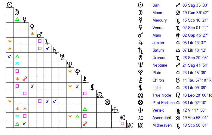| Moon | 19 Cancer 35 | 3 Aquarius 30 | 1 Pisces 17 |