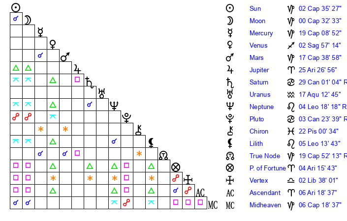 | Moon | 0 Capricorn 27 | 22 Libra 30 | 11 Sagittarius 17 |