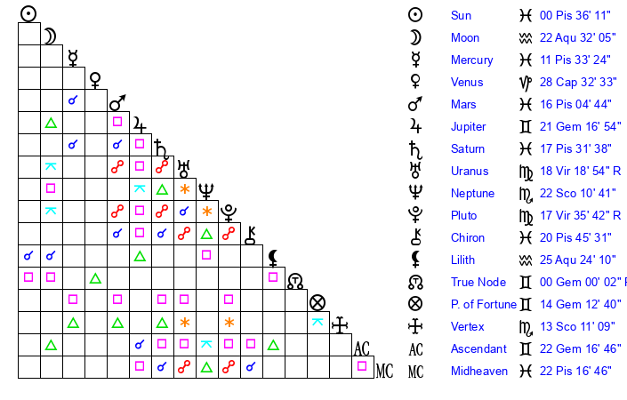 Moon | 22 Aquarius 28 | 19 Scorpio 53 | 16 Aries 3 |