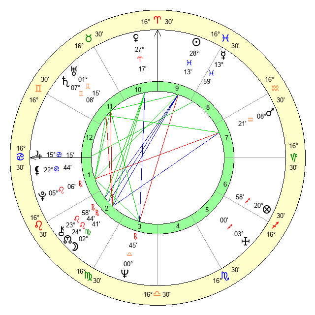 | Moon | 2 Virgo 42 | 28 Scorpio 12 | 2 Virgo 20 |