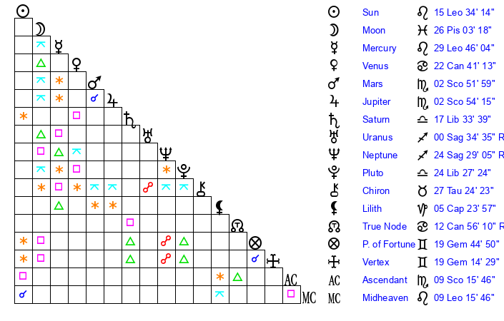 | Sun | 15 Leo 34 | 16 Leo 9 | 27 Virgo 9 |