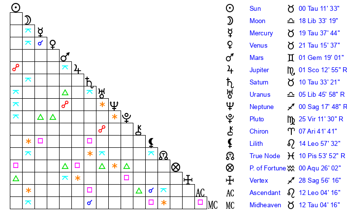 Sun | 0 Taurus 11 | 0 Taurus 52 | 23 Gemini 13 |