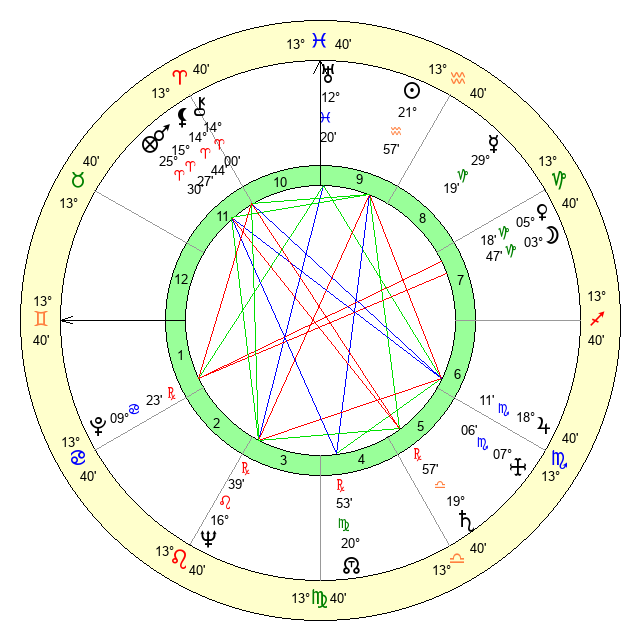 | Sun | 21 Aquarius 57 | 23 Aquarius 13 | 2 Gemini 29 |