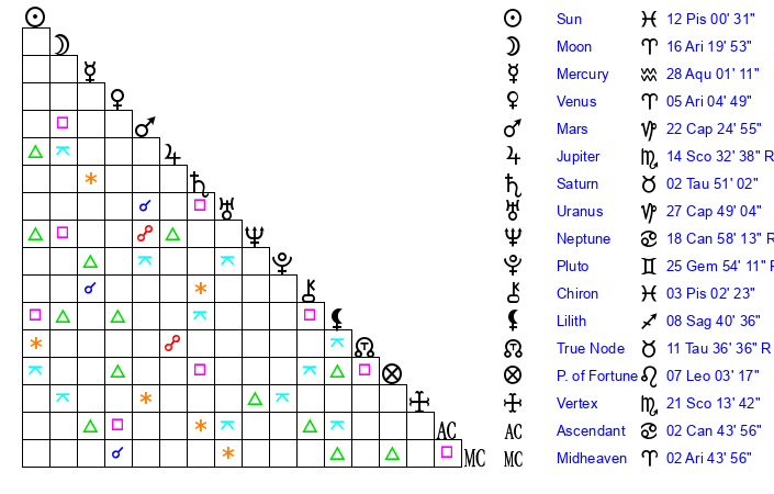 Sun | 12 Pisces 1 | 13 Pisces 22 | 3 Cancer 0 |