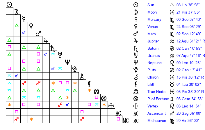 | Moon | 21 Pisces 33 | 11 Aquarius 25 | 13 Aries 54 |