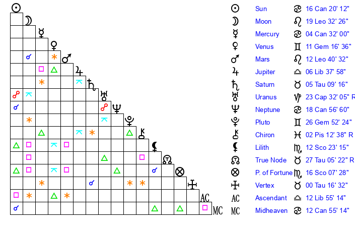 | Mercury | 4 Cancer 32 | 12 Leo 38 | 1 Scorpio 11 |
