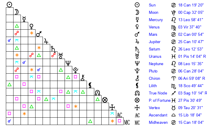 | Sun | 18 Cancer 19 | 19 Cancer 38 | 1 Scorpio 13 |