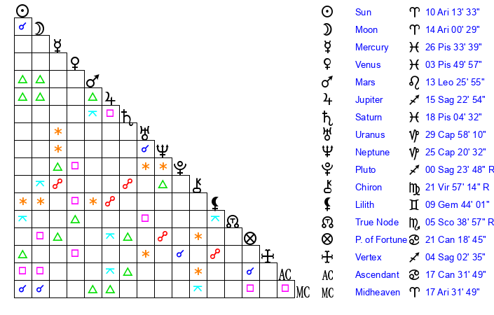 Moon | 13 Aries 51 | 8 Taurus 36 | 16 Taurus 59 |