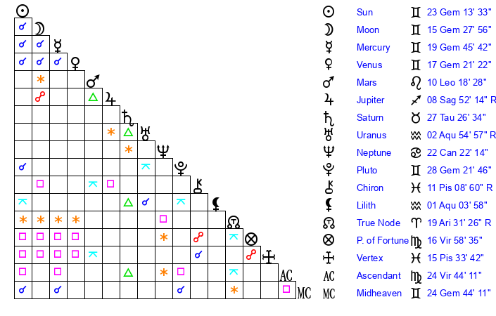 Sun | 23 Gemini 13 | 23 Gemini 53 | 12 Libra 5 |