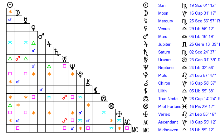 | Sun | 19 Scorpio 1 | 19 Scorpio 33 | 2 Aquarius 9 |
