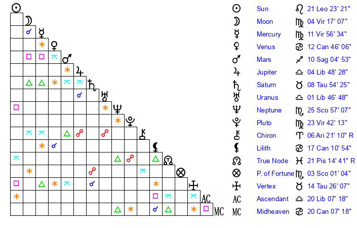 | Moon | 4 Virgo 26 | 27 Aries 17 | 21 Virgo 39 |