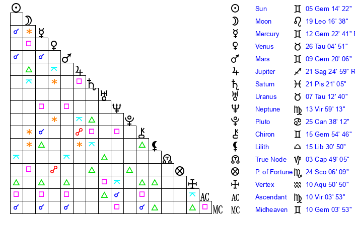 | Jupiter | 21 Sagittarius 11 | 26 Gemini 50 | 14 Sagittarius 37 |