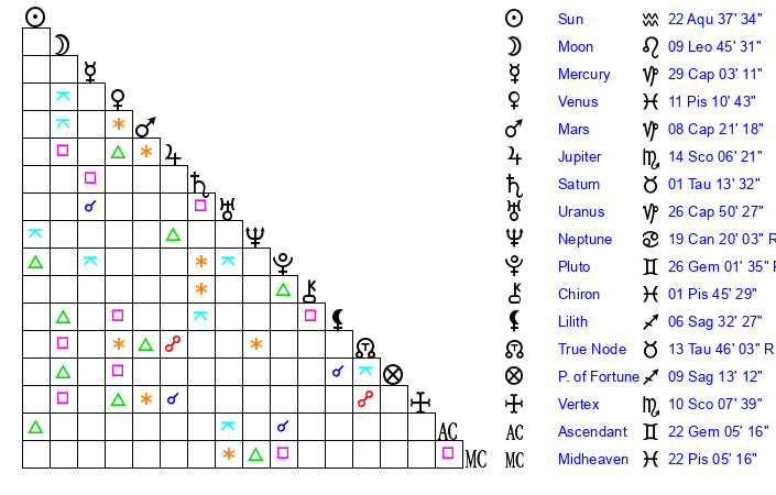 Sun | 22 Aquarius 38 | 23 Aquarius 59 | 14 Gemini 37 |
