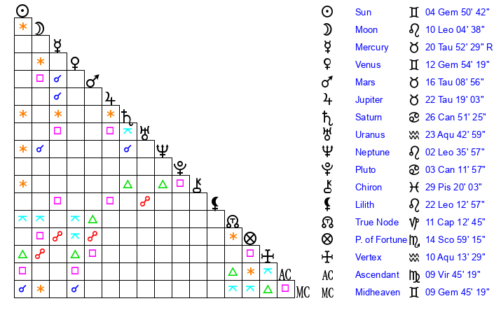 | Neptune | 2 Leo 36 | 1 Aries 45 | 6 Leo 11 |