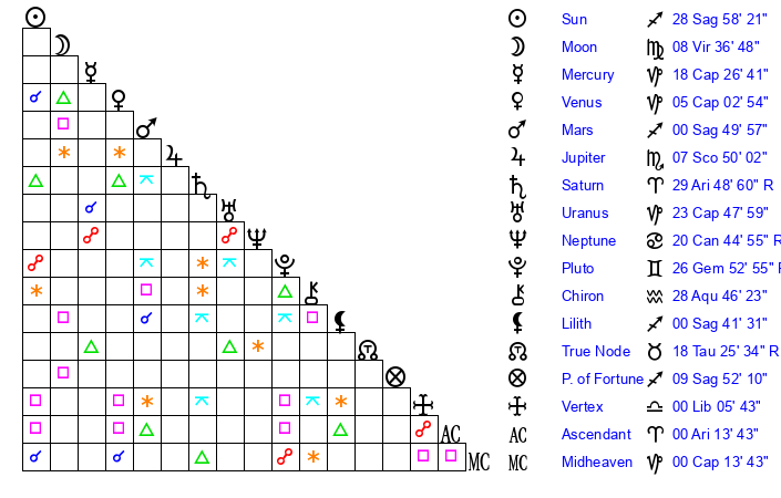 Sun | 28 Sagittarius 58 | 0 Capricorn 20 | 23 Aries 38 |
