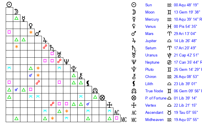 | Venus | 0 Pisces 54 | 18 Pisces 34 | 10 Aries 13 |